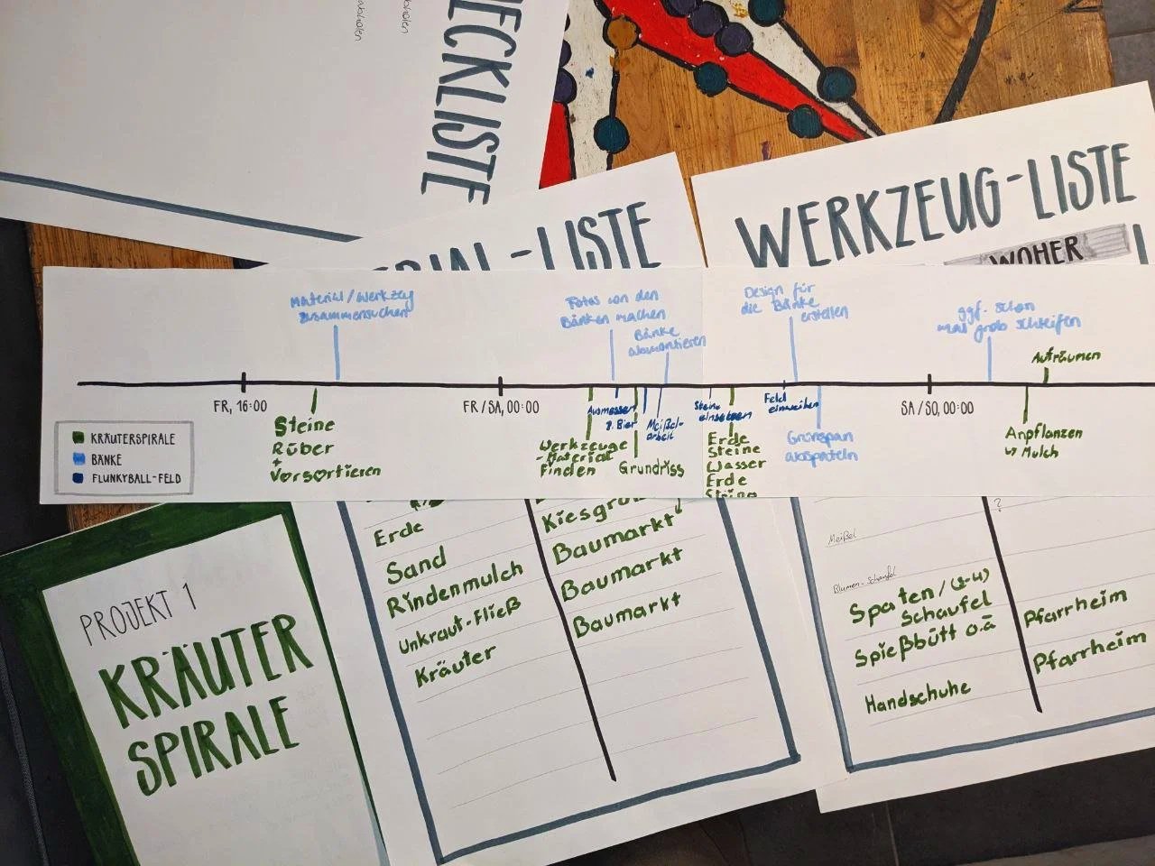 Beim Aktionswochenende haben wir einiges umgesetzt bekommen und hatten zugleich sehr viel Spaß einfach durch die gemeinsame Zeit. Die Bänke, die wir von der Stadt zur Verfügung gestellt bekommen haben, haben wir abmontiert und abgeschliffen. Das Lackieren mussten wir nur leider aufgrund von Zeitmangel auf eine der nächsten Gruppenstunden verschieben. Dafür haben wir die Kräuterspirale und das Flunkyballfeld fertig bekommen. Das Flunkyballfeld wurde natürlich direkt abends erfolgreich eingeweiht.