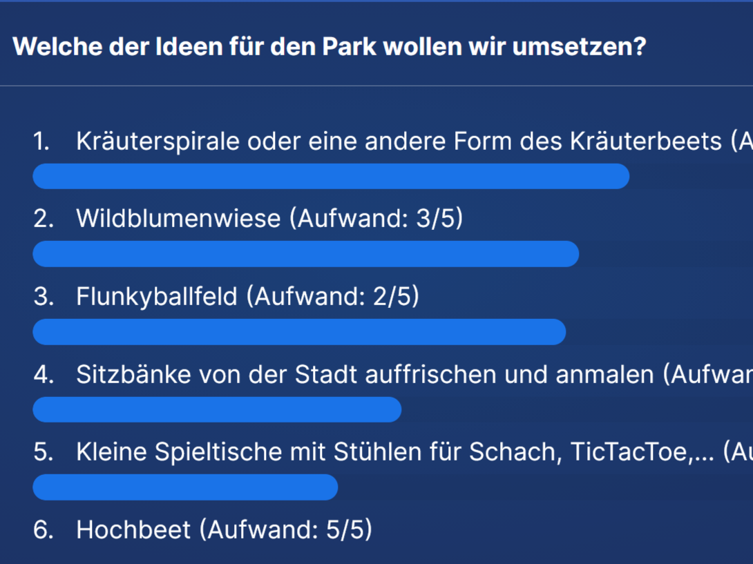 In der folgenden Woche haben wir tatsächlich mit dem Forstamt telefoniert und mussten feststellen, dass die Mülleimer-Idee leider nicht umsetzbar ist. Daher haben wir stattdessen mit der zweiten Idee von der Abstimmung weitergemacht: Die Umgestaltung eines nahgelegenen Parks zum ultimativen Begegnungsort. Dazu haben wir uns wieder erst einmal Inspirationsbilder angeschaut was in so einem Park alles möglich wäre. Mithilfe von analogen und digitalen Karten des Parks haben die Rover*innen dann wieder mit Bastelmaterialien und Fimo Ideen für den Park weiterentwickelt. Am Ende der Session haben wir uns bei einer Abstimmung für insgesamt 4 Ideen entschieden, die wir im Park umsetzen wollen: Eine Kräuterspirale, eine Wildblumenwiese, ein Flunkyballfeld und Sitzbänke (gesponsert von der Stadt).