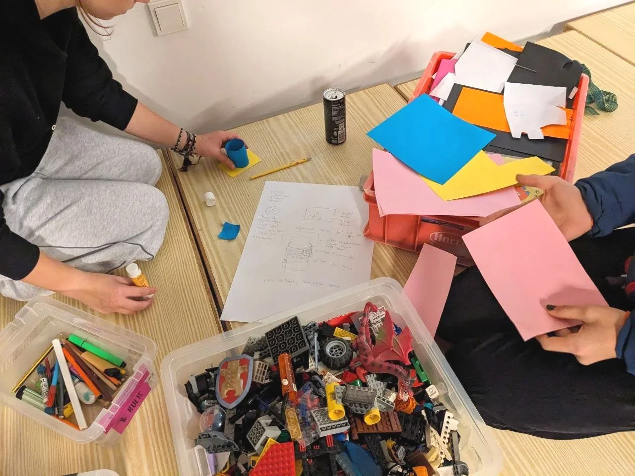 Eigentlich wollten wir bis diese Woche beim Forstamt erfragen, ob wir das Projekt mit den Mülleimern umsetzen dürfen. Leider hatten wir niemanden erreicht. Daher ging es erstmal einfach weiter mit der Konzeption der Mülleimer. Nach ein bisschen Input durch die Leiter*innen mit Inspirationsbildern haben die Rover*innen mit Bastelmaterial und Klemmbausteinen eigene kleine Modelle gebaut. Am Ende haben wir uns alle angeschaut und uns für eine Kombination aus zwei Entwürfen entschieden.